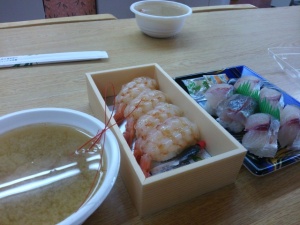 ボタンエビと鯵の寿司を購入し味噌汁を飲む・・